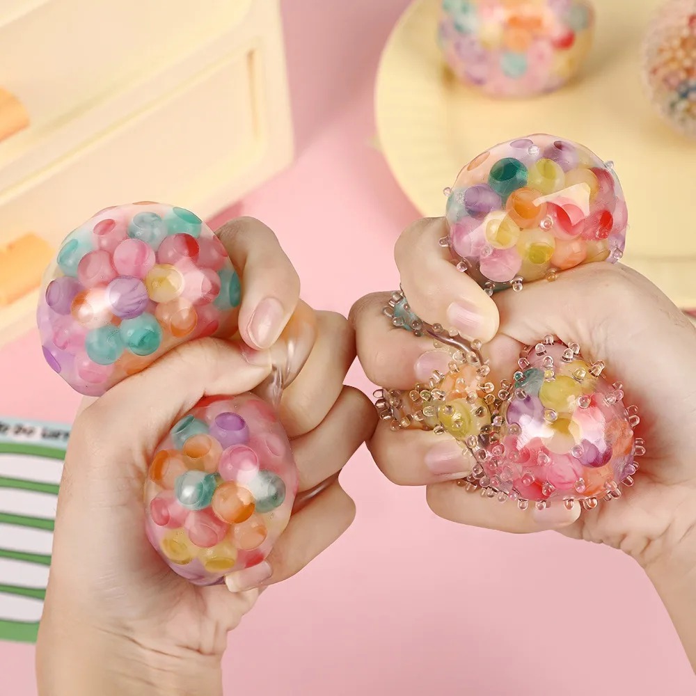 Perle d’Eau Colorée Squishy, une balle sensorielle unique en son genre, remplie de micro-perles d’eau colorées. Son effet raisin se forme lorsqu’on la presse, offrant une sensation tactile relaxante et visuellement satisfaisante.